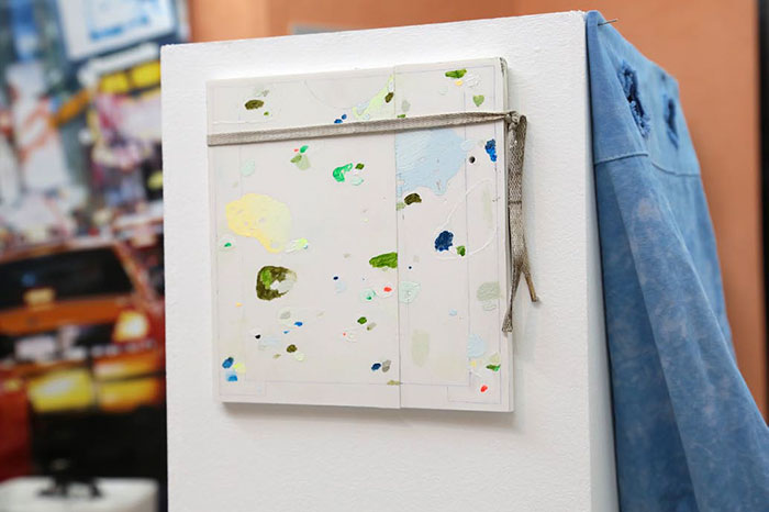 Anthony Jacquot-Boeykens Automne-hiver huile sur forex, crayon de papier, lacet, stylo bille bleu 20x20cm courtesy de l’artiste 2013